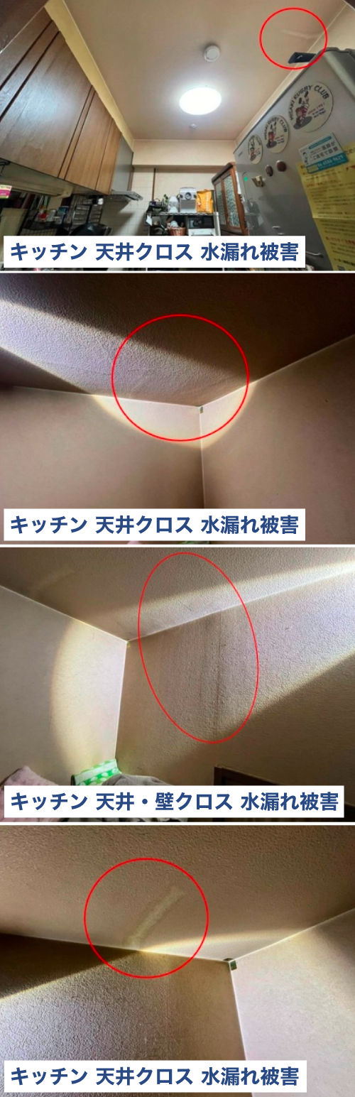 キッチン天井クロス(直貼り)、キッチンの壁クロスの⽔濡れ被害を確認しました。