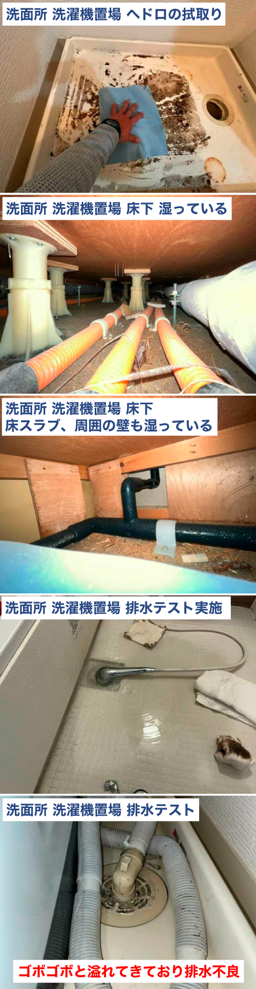洗⾯点検⼝より床下を確認したところ、床下から約20cm程プール状に⽔が溜まっていた為バキューム処置から開始。