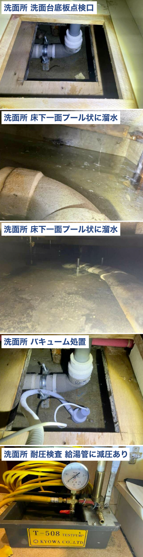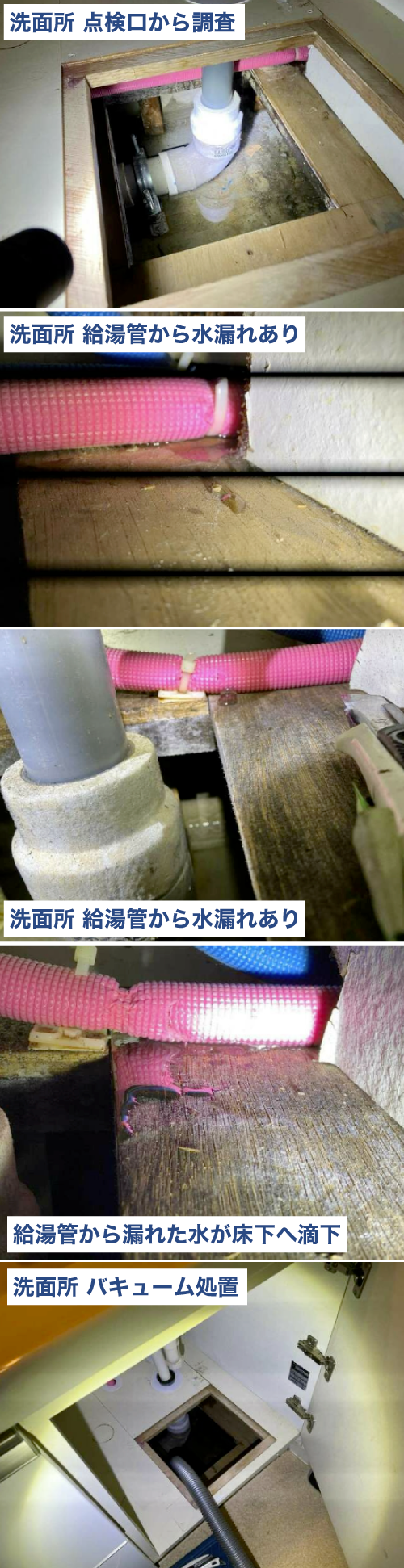 洗⾯台床下で漏⽔しているとの連絡を受け調査を実施。