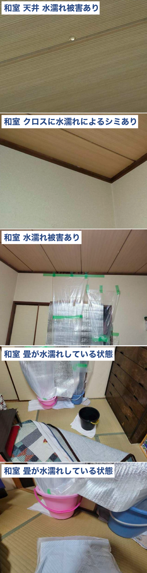 和室の天井や壁・畳に⽔濡れ被害を確認しました。