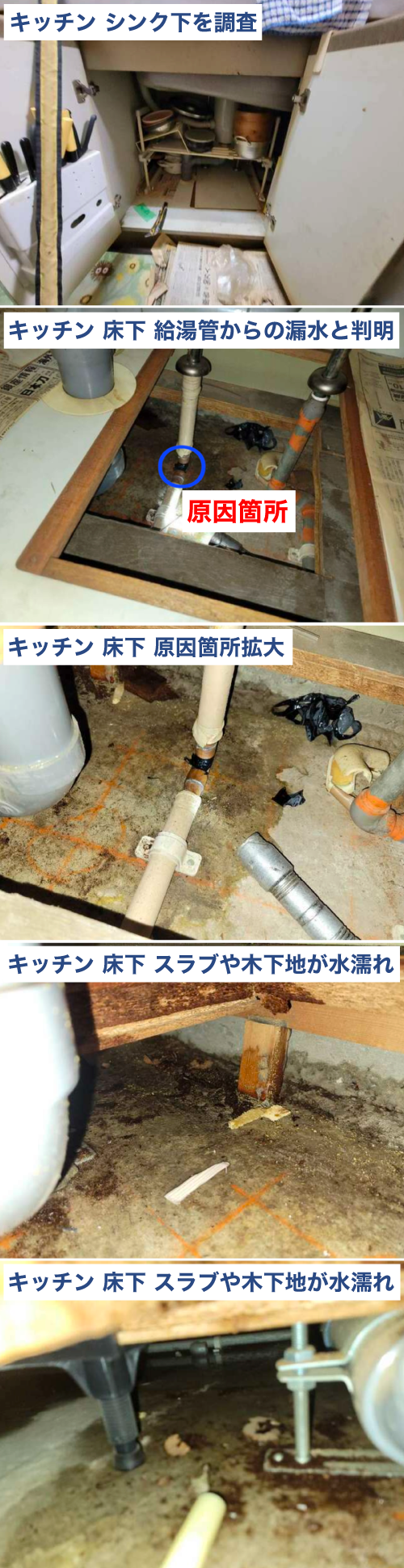 上階の調査を実施した結果、キッチン床下の給湯管からの漏⽔と判明しました。