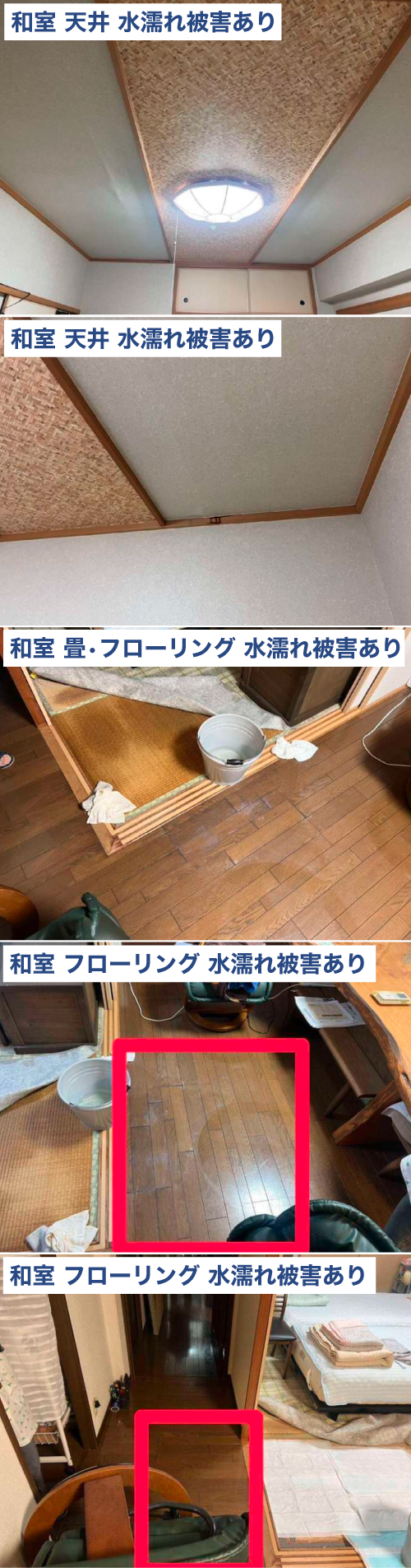 調査の結果、リビング、和室の⽔濡れ被害を確認しました。
