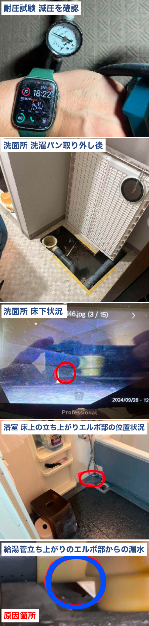 後日調査の結果、浴室給湯管の⽴ち上がりエルボ部から漏⽔を確認した。