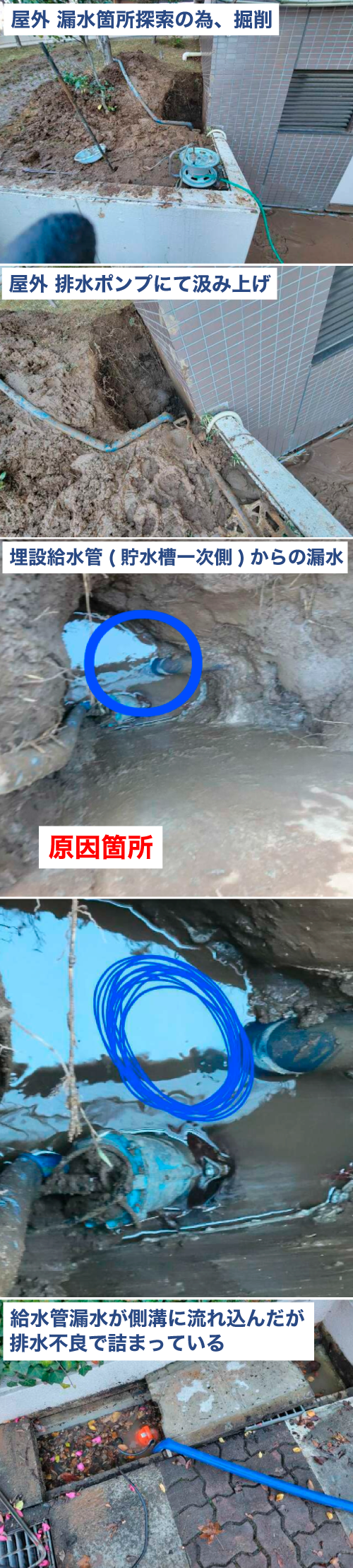 掘削箇所の⽔を排⽔ポンプにて汲み上げを⾏ったところ、埋設給⽔管(貯⽔槽⼀次側)より漏⽔していることが判明。