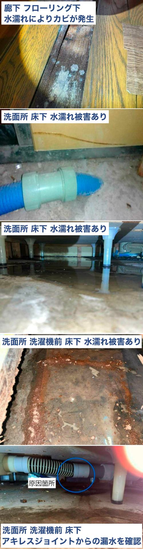 居住者様へ洗濯の排⽔をしていただき床下を調査した結果、洗濯パントラップのアキレスジョイントから漏⽔するのを確認。洗濯機の使⽤を当⾯控えていただくようお伝えし、対応完了。