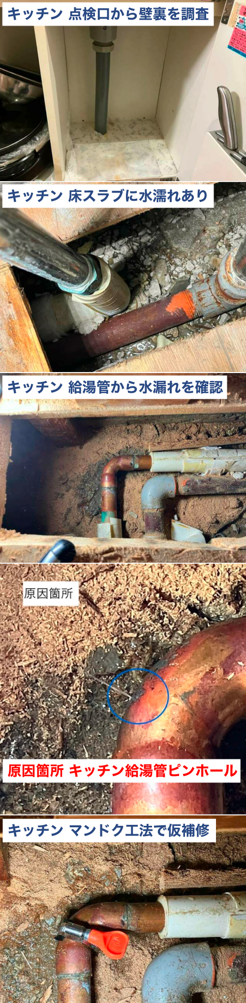 キッチン背板点検⼝を取り外し、床を開⼝し配管を調査した結果、キッチン給湯管ピンホールによる漏⽔と判明。