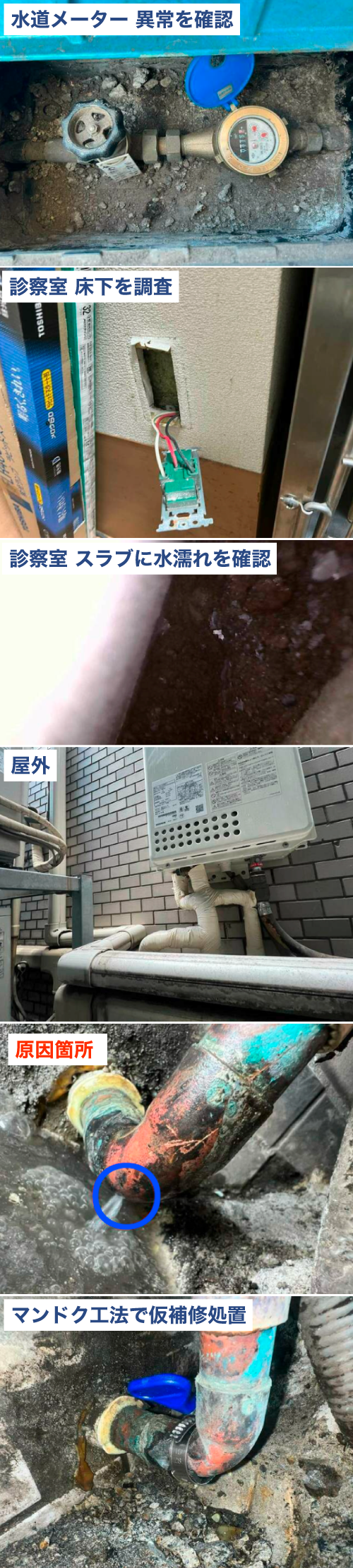 ⽔道メーターに異常がある連絡を受け、調査を実施。