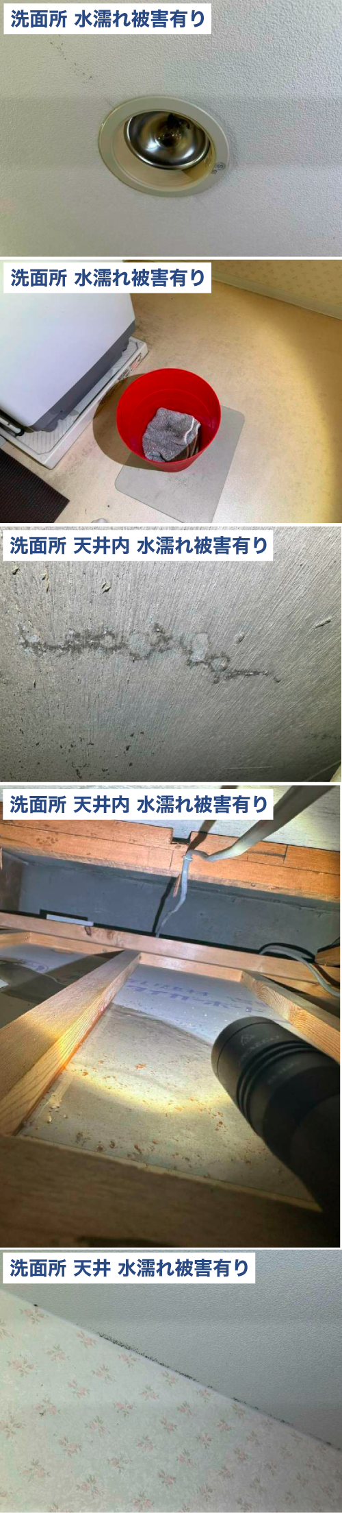漏⽔発⽣との連絡を受け調査を実施。洗⾯所天井から⽔漏れを確認。雑排⽔縦