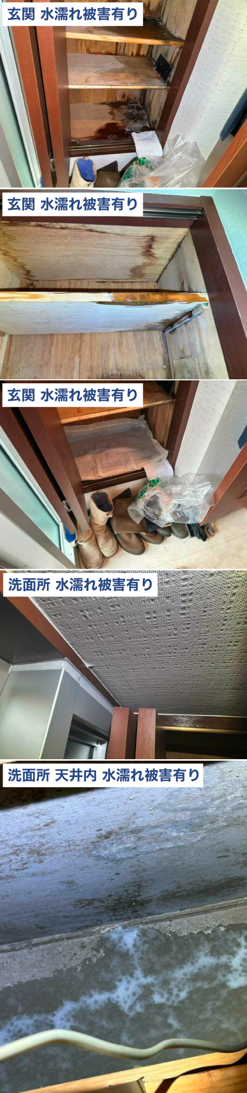 漏⽔が発⽣していると連絡を受け、調査を実施。⽞関の靴⼊れに⽔濡れ被害を確認。調査時は漏⽔が⽌まっていたが、靴⼊れのベニアが広範囲で⽔濡れし、⼀部カビも発⽣していた。洗⾯所の天井内も調査し、⽔濡れ被害を確認。靴⼊れに含み⽔が多かった為、念のため吸⽔シートを設置して調査は終了。