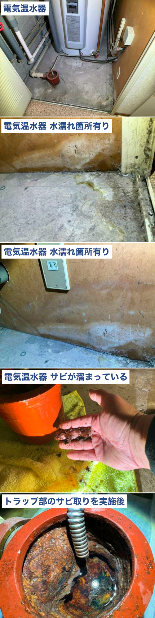 下の階で漏⽔が発⽣していると連絡を受け、調査を実施。洗⾯所・浴室で排⽔テストを実施するも、⽔漏れは発⽣せず。電気温⽔器室を調査したところ、⽔濡れを確認。温⽔器の逃し弁⽤トラップにサビが溜まり⽔が溢れていることが判明。トラップ部のサビ取り処置を⾏い、5分通⽔テストを実施して漏れが発⽣しないことを確認してい調査は終了。