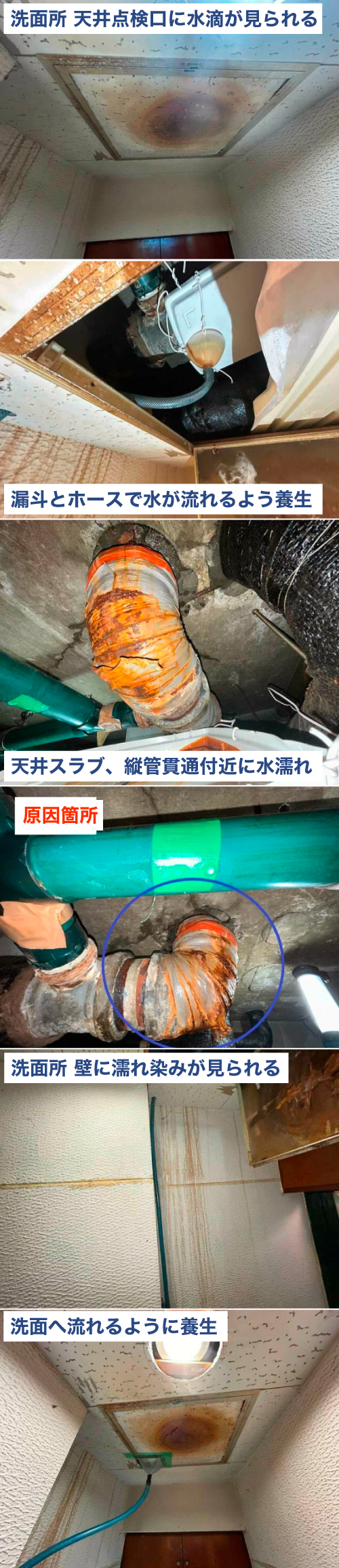 管貫通付近での漏⽔と判明。トレー、漏⽃、ホース、プラ段などを使って洗⾯へ流れるよう養⽣し処置。共⽤部PSを調査し異常が無い事を確認し対応完了。