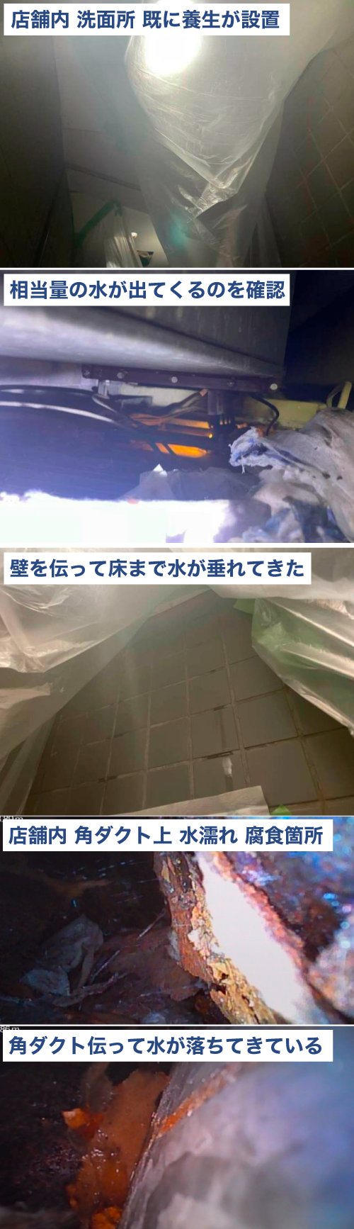 地下1階店舗内の天井横引き排⽔配管(鋳鉄横引き管)の下場に⼤きい⽳が空いてしまっているようで、洗⾯器1杯分の⽔を1階店舗の⼿洗い場から流すと、ほぼその量まるまる地下1階店舗の洗⾯所天井から落⽔してきた。
