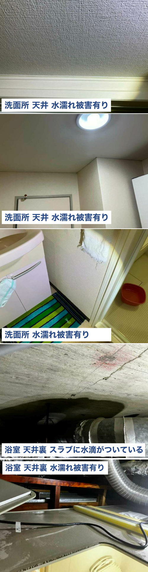 洗⾯所の天井・壁クロスに⽔濡れによるシミ有り。浴室点検⼝より、洗⾯所と浴室の天井内を確認。天井スラブに⽔滴がついており、落⽔で下地・ボードが⽔濡れしていた。吸⽔シートを設置して調査終了。