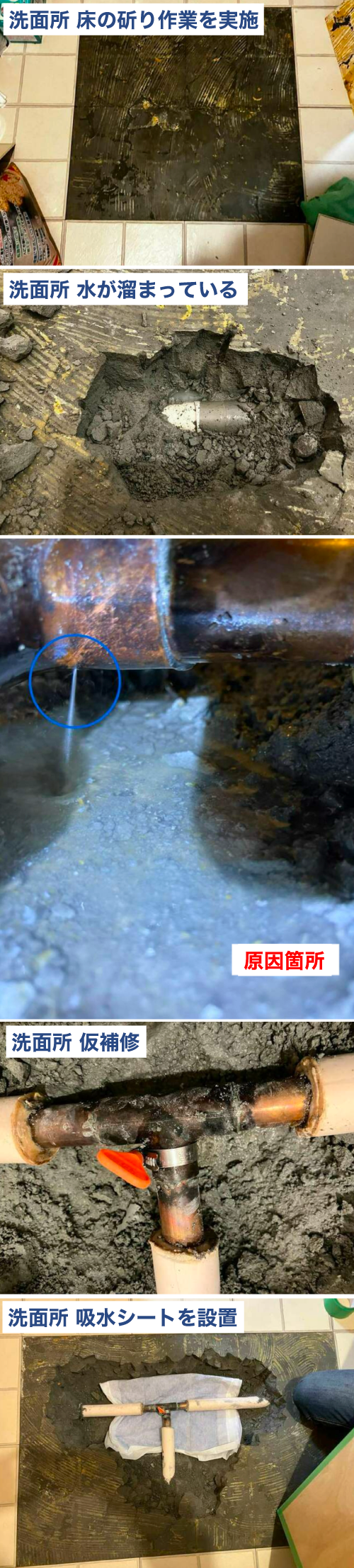 給湯管付近には⽔が溜まっており、洗⾯所の床埋設給湯管にピンホールが形成されていることが判明。