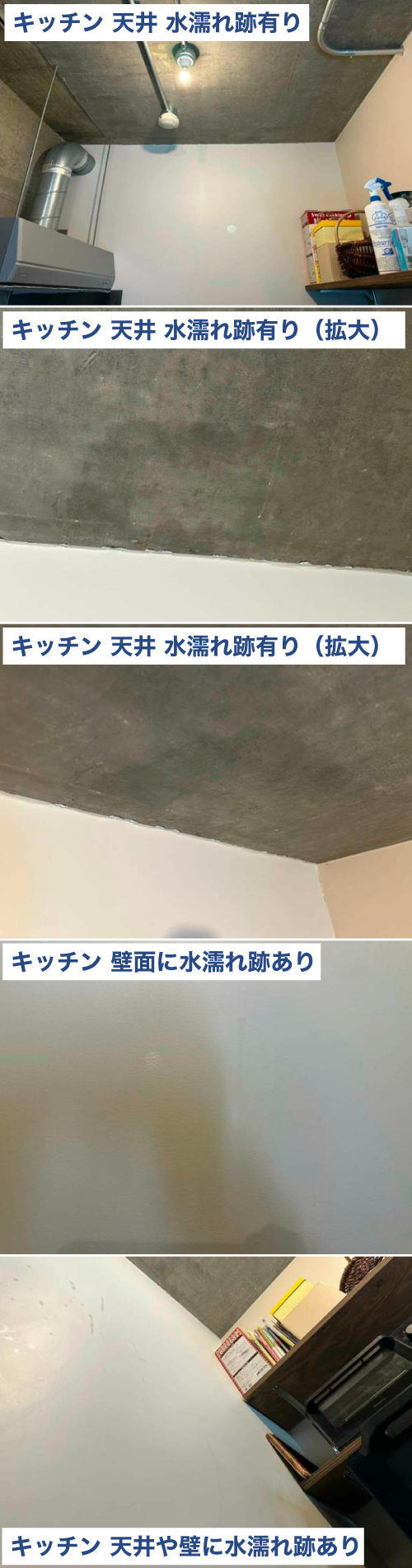 天井裏スラブは既に乾いていたが、キッチンの天井壁ボード表⾯に⽔濡れ被害を確認しました。