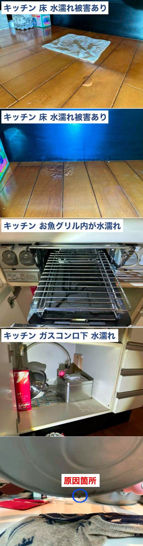 ビルトインのガステーブルに置いていた、やかんの中から徐々に⽔が漏れ、ガスコンロ、キッチンシンク下、フローリングと順番に漏⽔が広がっていた。